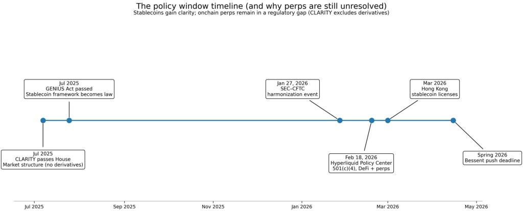 Timeline shows stablecoins gained regulatory clarity through GENIUS Act while CLARITY excludes derivatives, leaving perpetuals unresolved as Treasury pushes spring 2026 deadline.